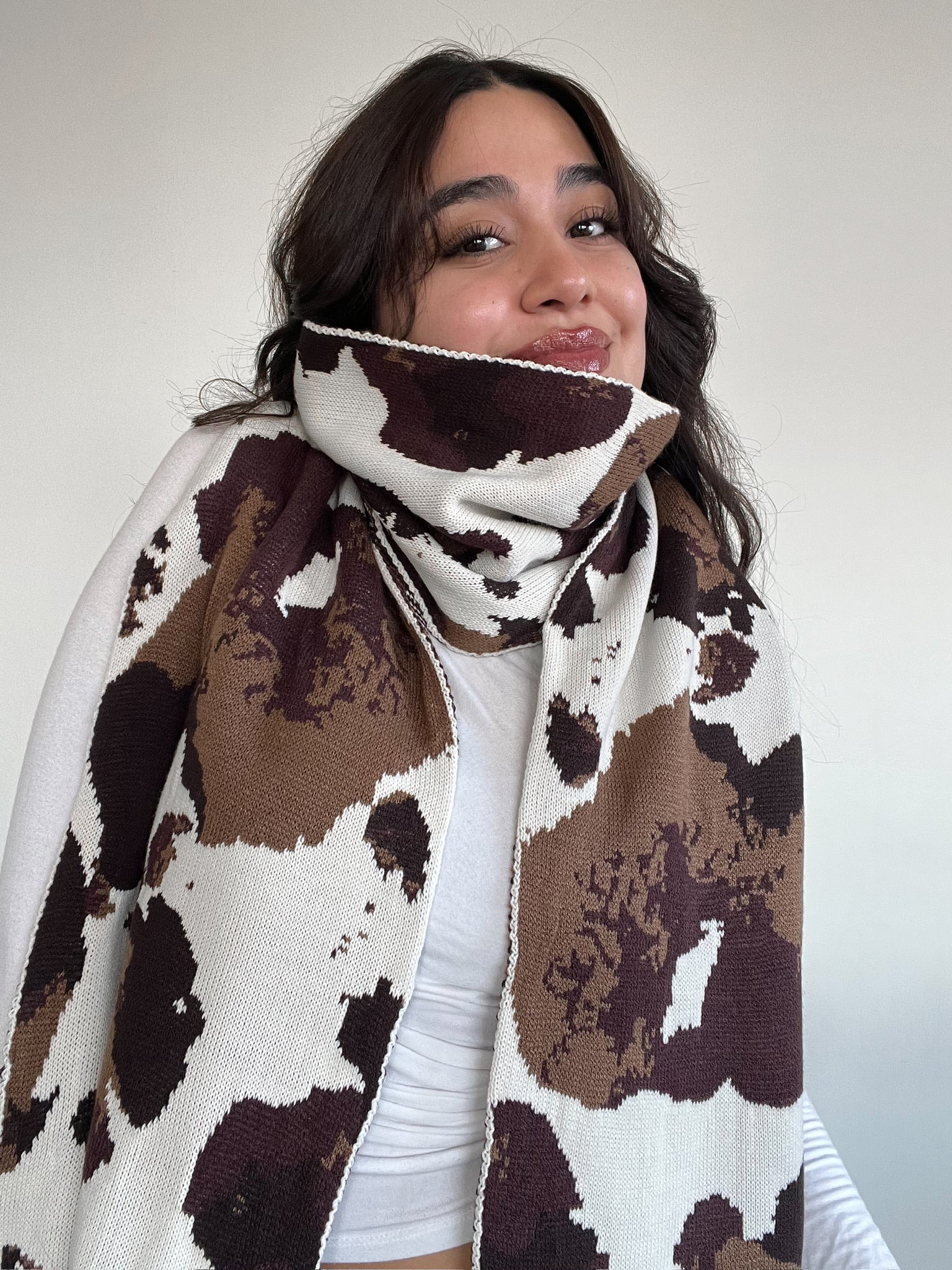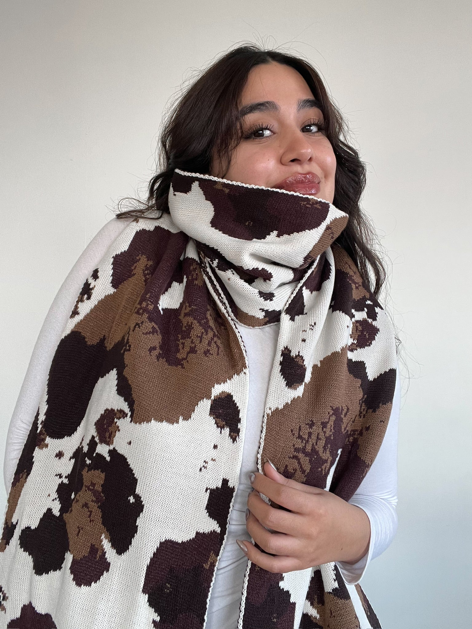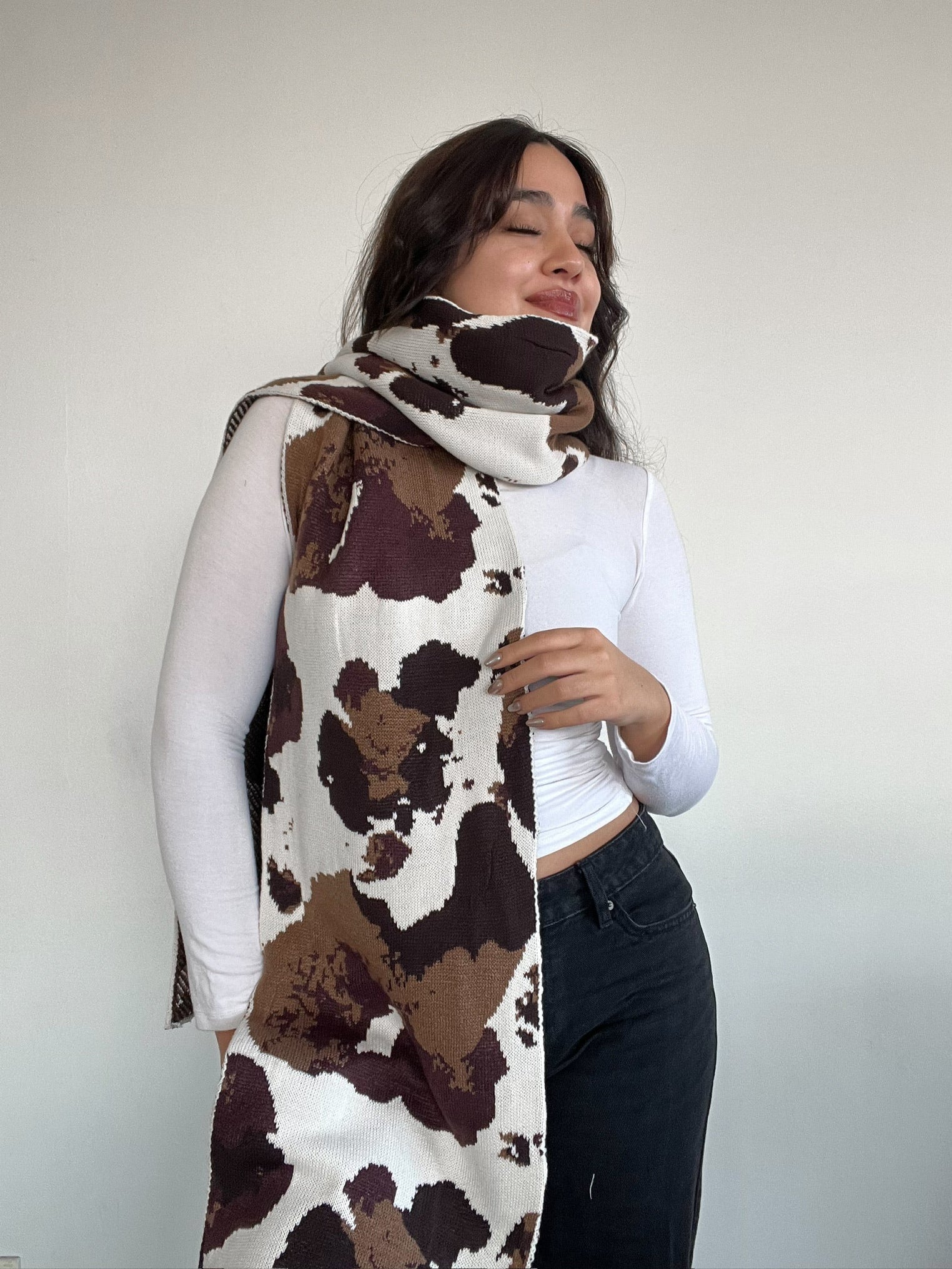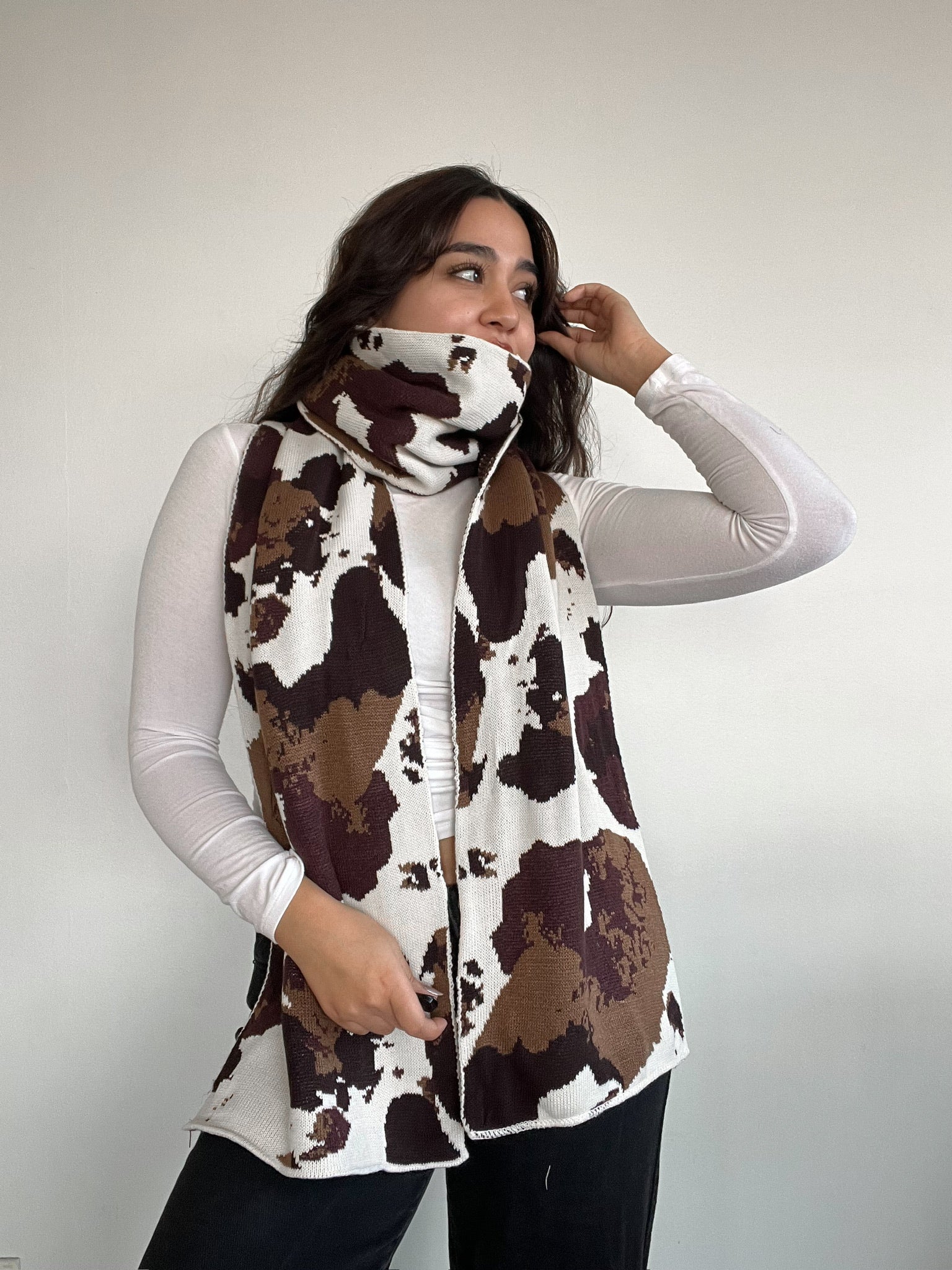 Maxi bufanda con diseño tipo cow print, perfecta para abrigarte con estilo. Su textura suave al tacto te envuelve como un abrazo, y su tamaño oversize la convierte en el complemento protagonista de cualquier outfit. Ideal para looks neutros con un toque bold.