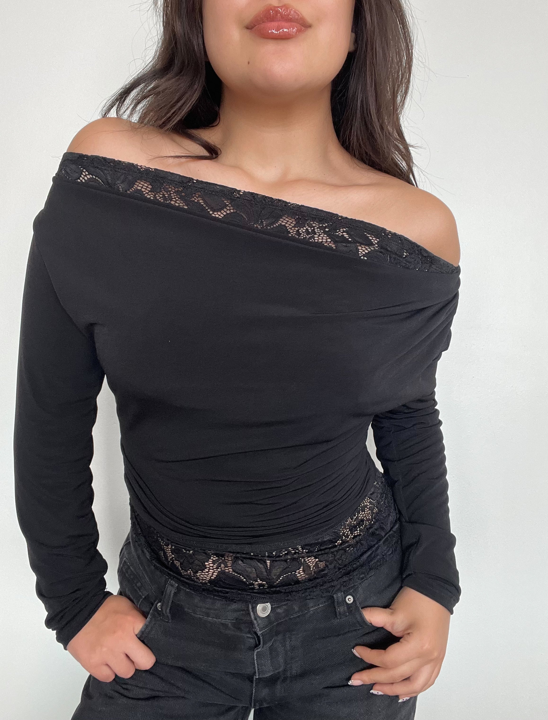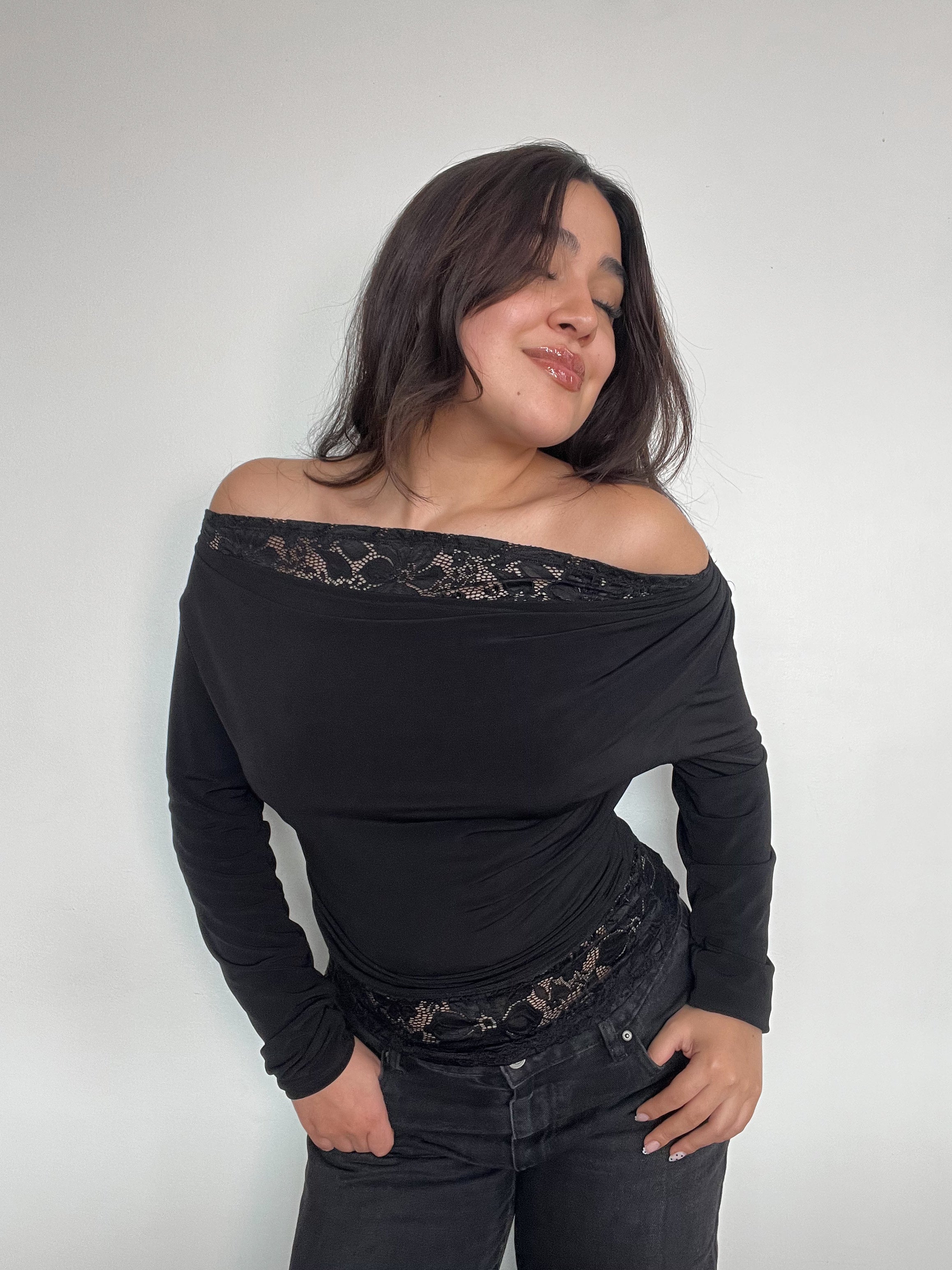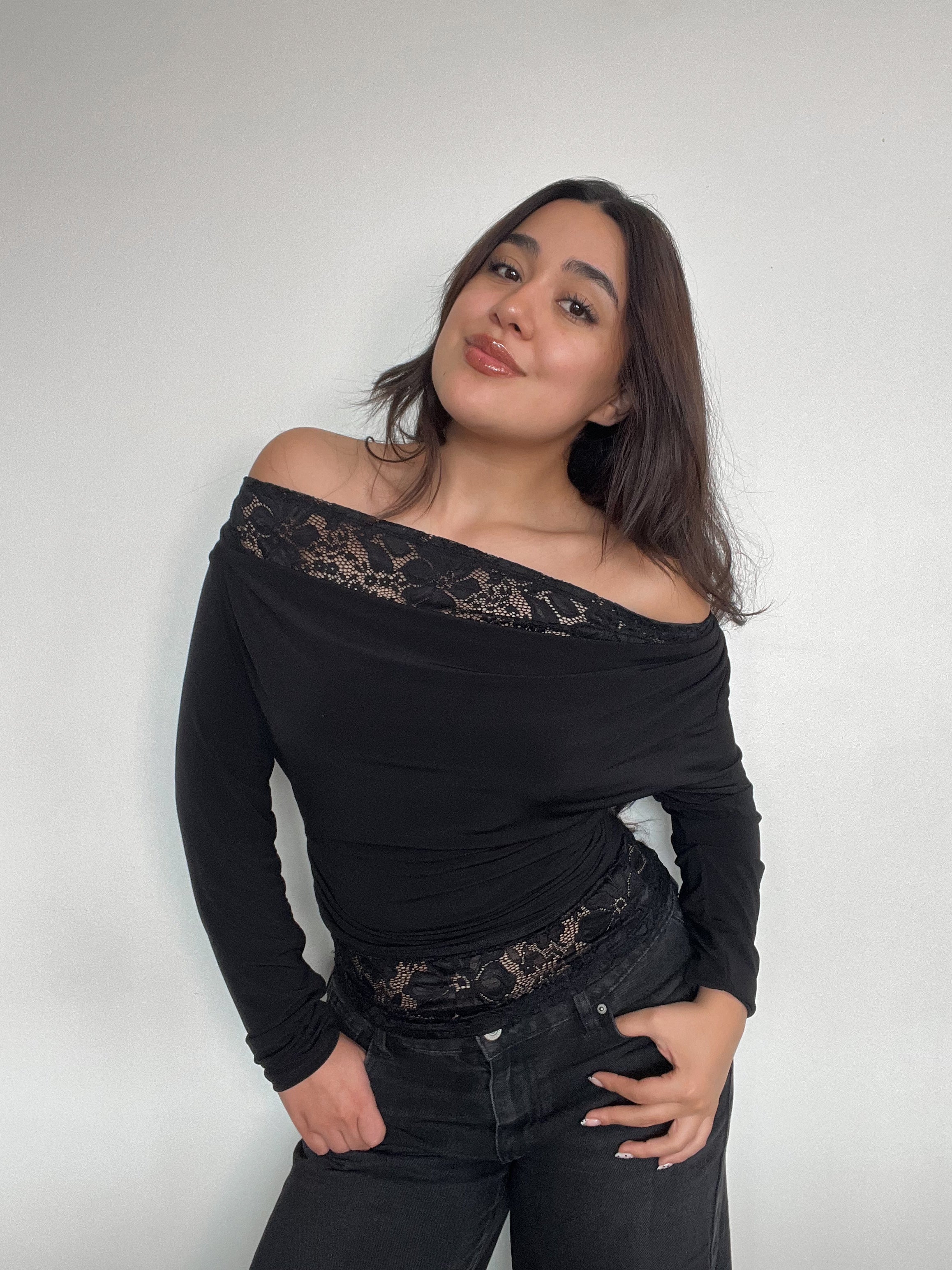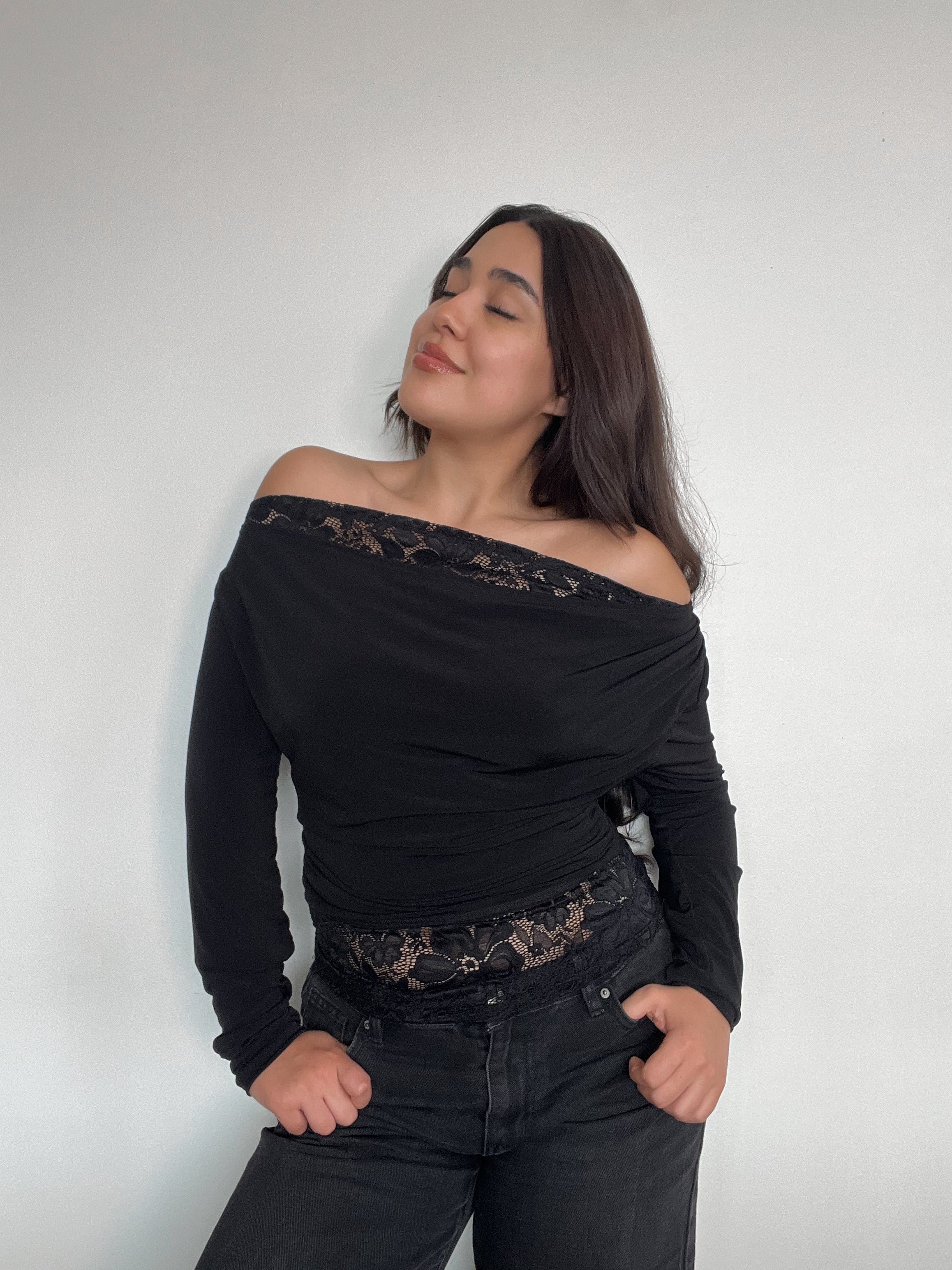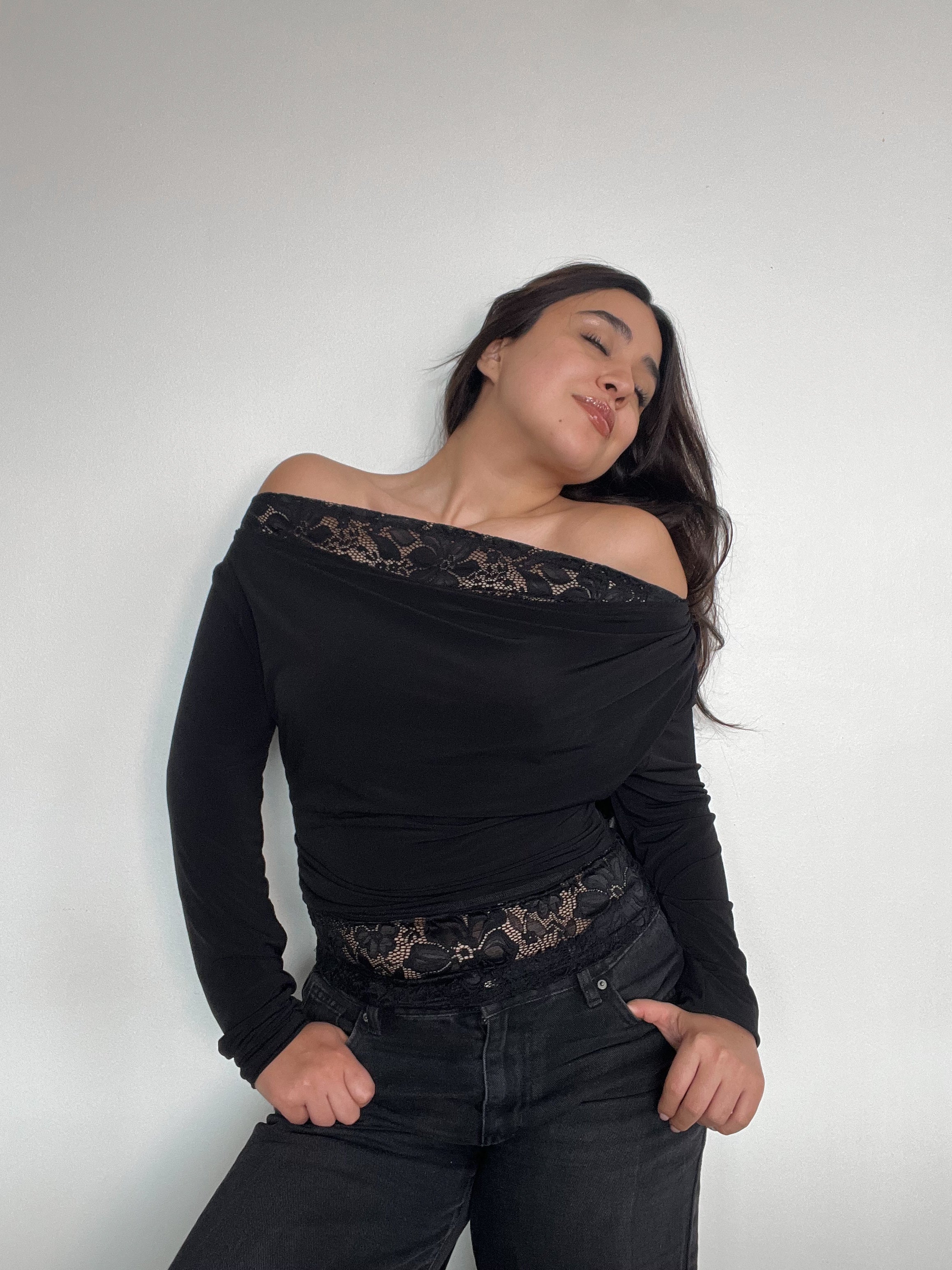 Top con detalle de encaje manga larga – comodidad y estilo en un solo diseño. Confeccionado en lycra elasticada con forro de doble tela, se ajusta perfecto al cuerpo.