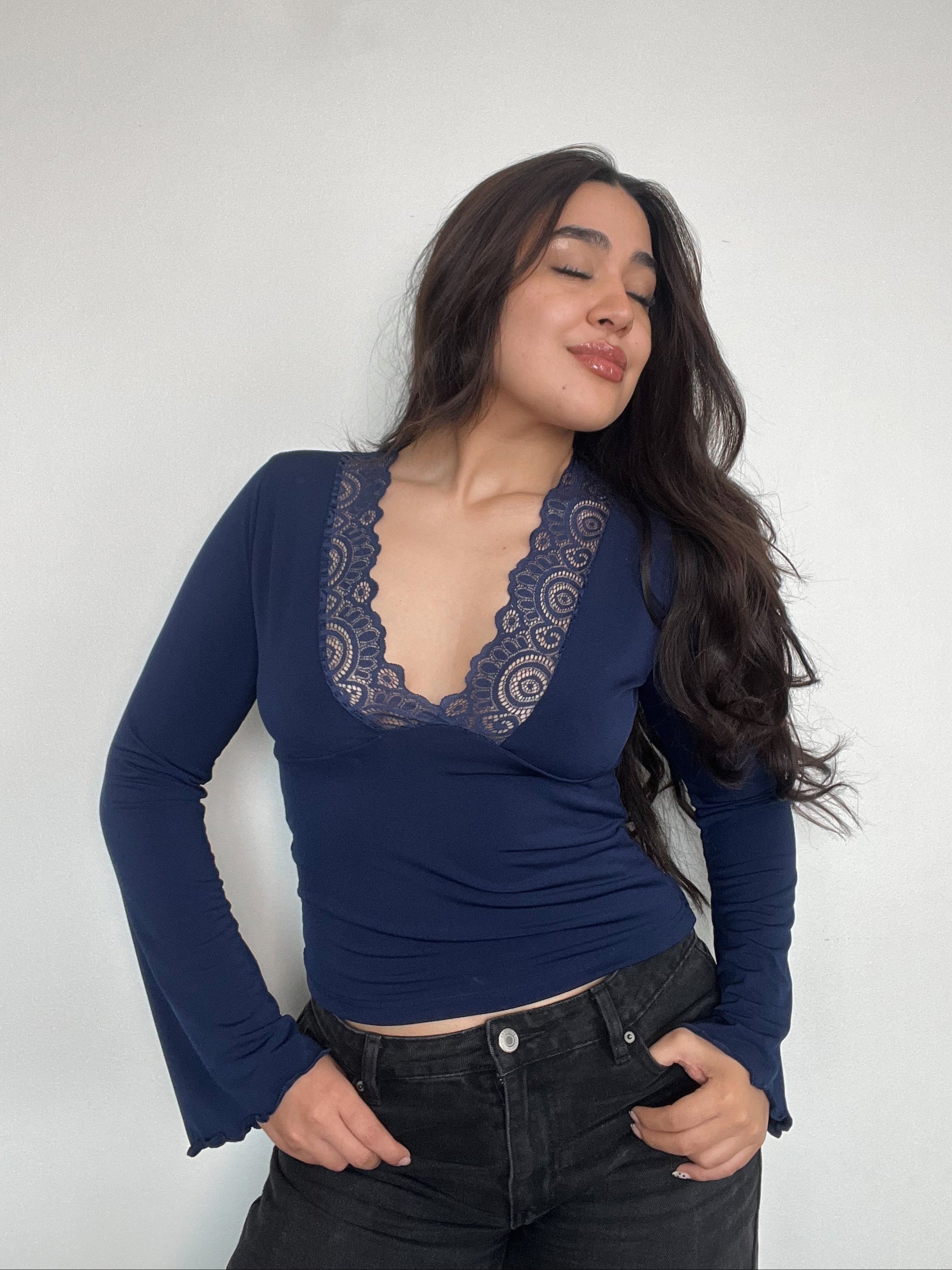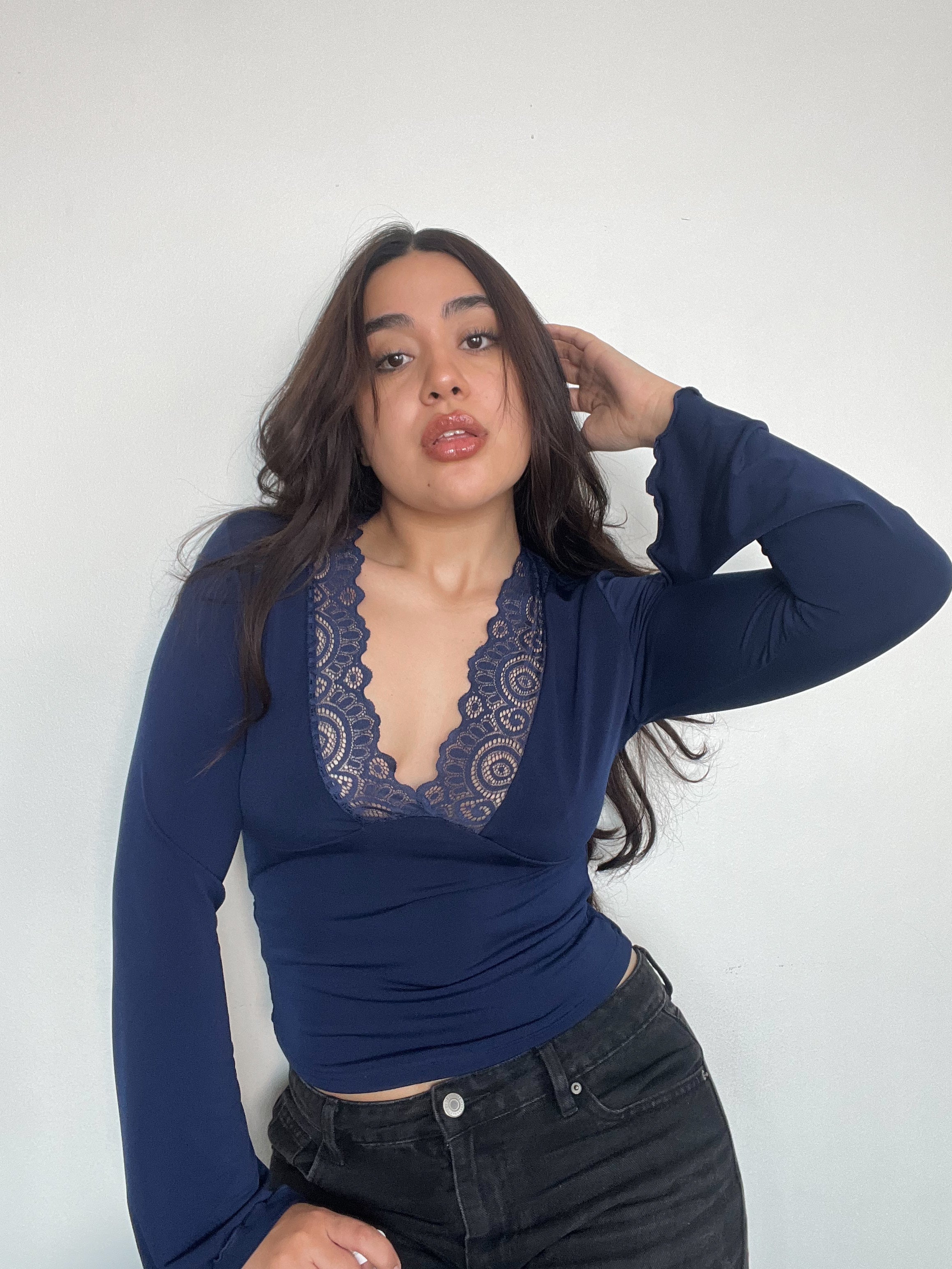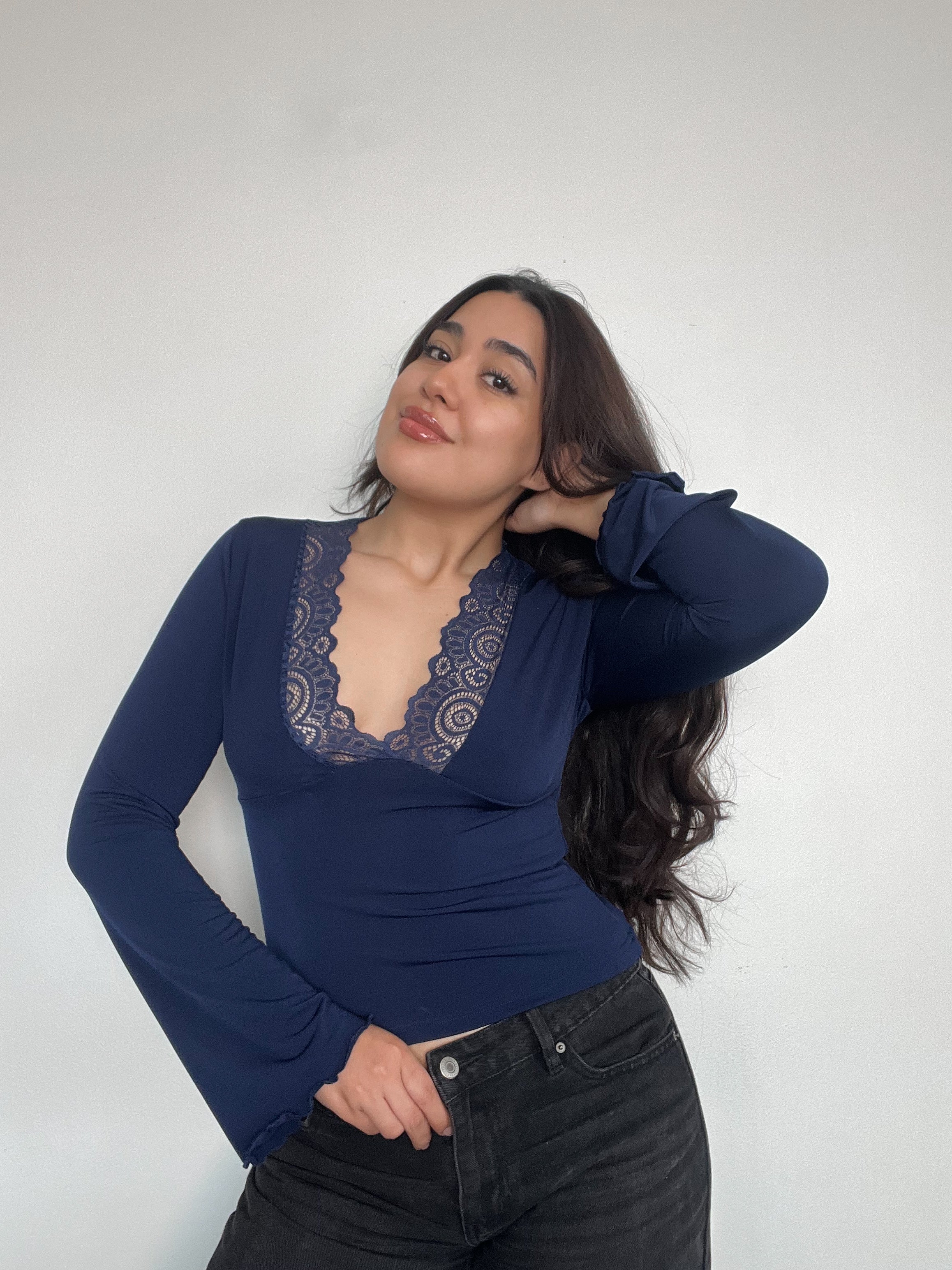 Top con detalle de encaje manga larga – comodidad y estilo en un solo diseño. Confeccionado en lycra elasticada con forro de doble tela, se ajusta perfecto al cuerpo.